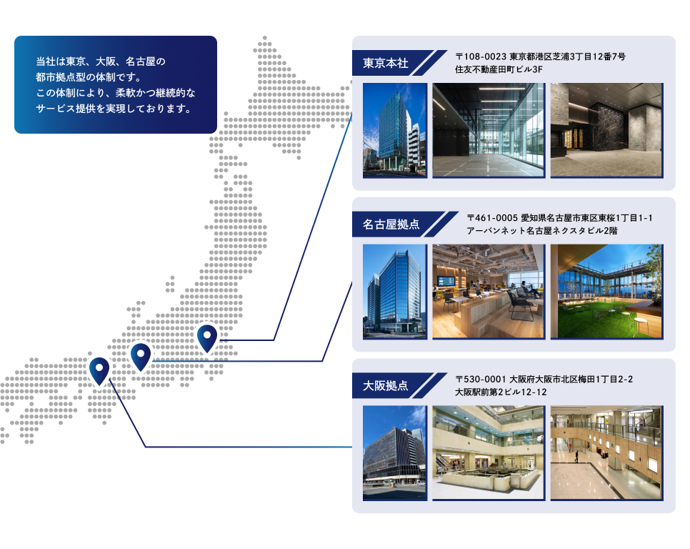 | 所在地 | <東京本社> 〒108-0023 東京都港区芝浦3丁目12番7号 住友不動産田町ビル3F <大阪支社> 〒530-0001 大阪府大阪市北区梅田1丁目2-2 大阪駅前第2ビル12-12 <名古屋拠点> 〒461-0005 愛知県名古屋市東区東桜1丁目1-1 アーバンネット名古屋ネクスタビル2階 |